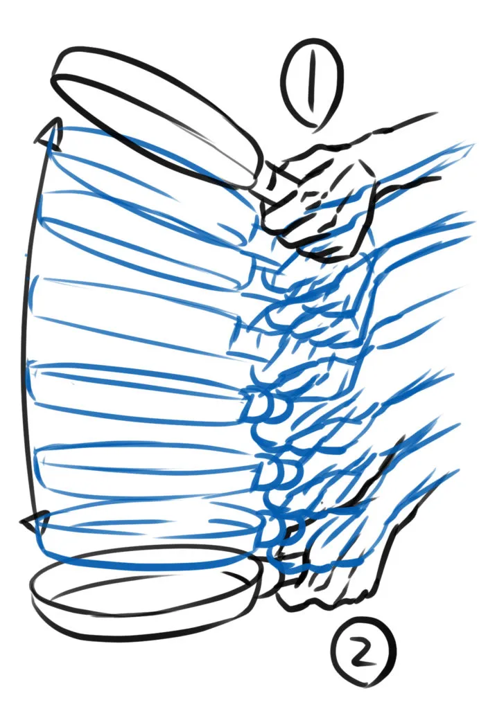 たとえばこの上げてるの①の原画から、下げてる②の原画まで1秒かかるとします。先述したディズニーアニメのフルアニメーションだと、上げてるの①の原画から下げてる②の原画まで、24枚もの絵を描くということになります。想像するだけで、大変さが伝わってきます。