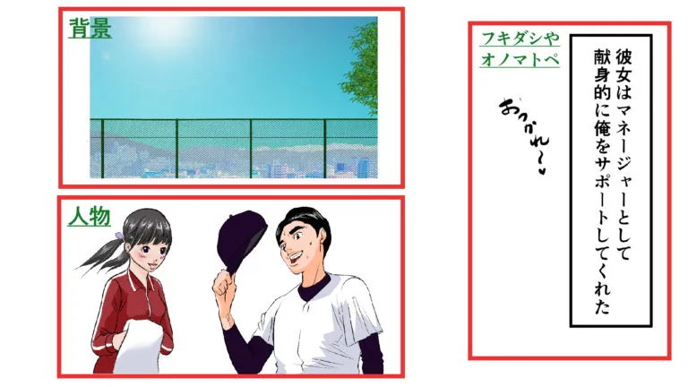 人物や、フキダシによって隠れている背景も描き加えましょう。